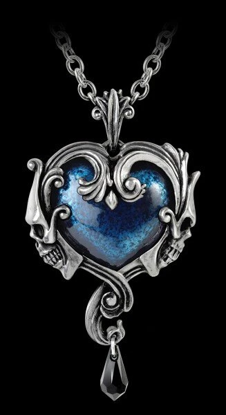A large pewter heart pendant, the centre piece enamelled in a transparent midnight blue and surrounded by an antiqued pewter Baroque frame with a skull profile on either side. There is a black Swarovski crystal teardrop suspended below and the pendant hangs from a pewter bale on a 32″ (82cm) long trace chain.