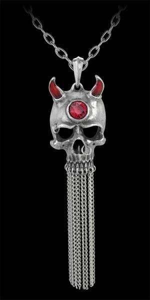 This Alchemy pendant is according to the Kabbalah, from the ancient union of King David and a succubus was born one of the seven princes of Hell, the demon of lust…A fully modelled demonic polished pewter skull, with red enameled horns and a red Swarovski crystal set into the forehead and lengths of fine chain dripping from the teeth. Suspended on a bale from a 21″ trace chain.