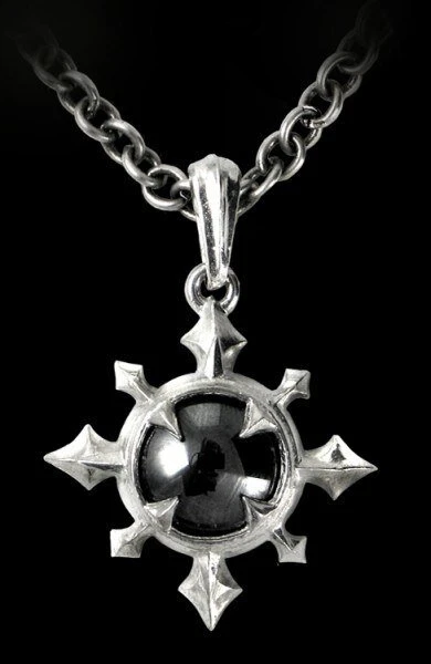 This Alchemy pendant is a shimmering, metallic hematine cabochon forms the nucleus of this mysteryshrouded symbol of anti-order; the eight arrows of chaos. All pendants are cast and hand-made in fine English pewter, many have additional high quality crystals and components, hand plated or other two-tone finish and come complete with nickel-free chain or other necklace of appropriate length.