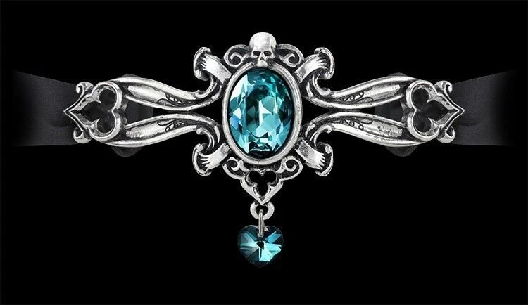 This Alchemy pendant is the Dogaressa of Venice, wife of the Doge of a crumbling empire. The once almighty power of the Doge of Venice was coming to an end, and the Doge himself, slipping from life. From the rich regalia of office, here is a last token of forlorn devotion to the bereaved Renaissance Lady of the Palace. A pewter choker piece styled of Baroque scrollwork, set with a large Swarovski crystal and with a matching crystal heart pendant, on a black satin velvet hand-tie ribbon.