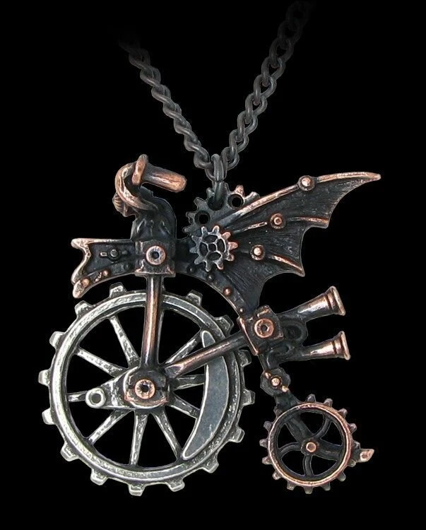 This Alchemy pendant is a ‘Vernian’ engineered interpretation of the humble penny farthing, energy-assisted by wind and crank-rail technology. Copper-plated, with rotating wheel.